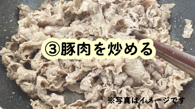 豚肉を炒めます。塩コショウをわりとしっかりめにかけて、備え付けのソース(粉)を1袋の半分くらい入れます。